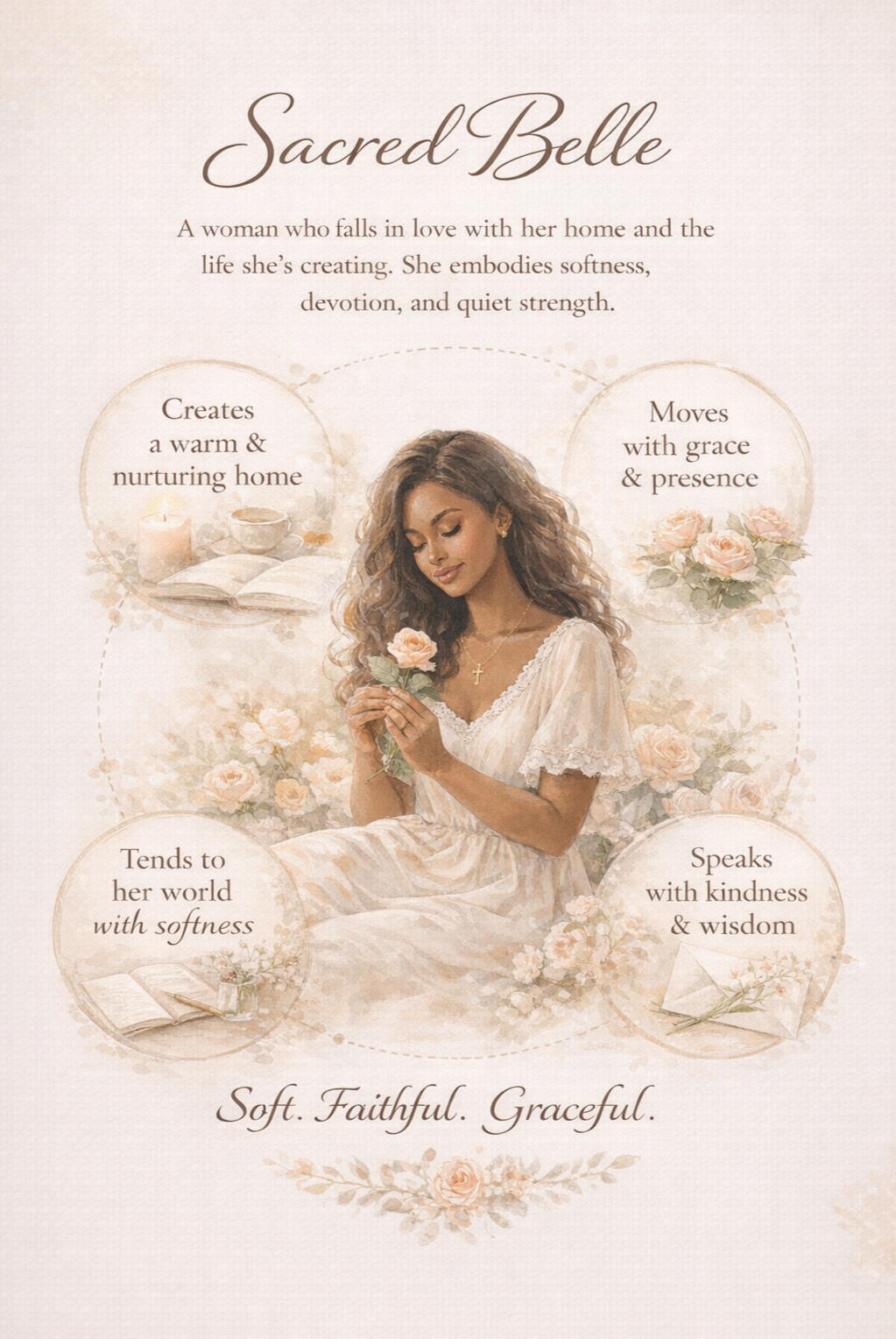 The SacredBelle is a woman who is learning to live differently crowned and carried, she moves through life with a quiet confidence not striving, not rushing, but rooted in who she is and who holds her. This is a space for women of faith who are returning to softness who love beauty, presence, and the sacredness of homeTogether, we are learning to lead softly in our lives, in our homes, and in all that we carry